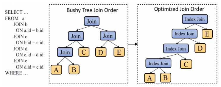 基于索引的Join和聚合 。将Join变为查找现有索引,全索引的设计进一步消除了构建哈希开销。当调整Join的顺序时,如果大多数Join列是分区列且具有索引,优化器会避免使用BushyTree,而更倾向选择LeftDeepTree。采用LeftDeepTree,AnalyticDB能更好地利用现有索引。优化器更近一步下推了谓词和聚合。聚合函数,比如count和查询过滤可以直接基于索引计算。所有这些组合降低了查询延迟,同时提高集群利用率,从而使得AnalyticDB能轻松支持高并发。
