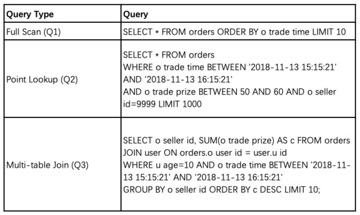 - 查询语句。针对真实数据集,选择了三种类型的查询语句,如表1所示,它们分别为全表扫描、点查询、多表关联查询。