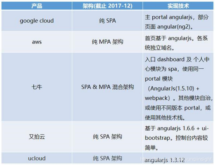 传统的云控制台应用,几乎都会面临业务快速发展之后,单体应用进化成巨石应用的问题。为了解决产品研发之间各种耦合的问题,大部分企业也都会有自己的解决方案。笔者于17年底,针对国内外几个著名的云产品控制台,做过这样一个技术调研: