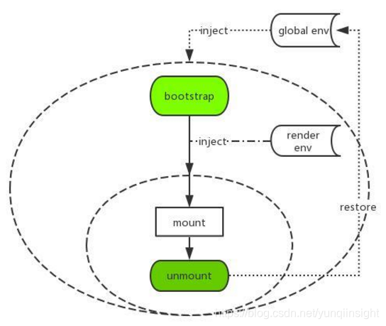 即在应用的 bootstrap 及 mount 两个生命周期开始之前分别给全局状态打下快照,然后当应用切出/卸载时,将状态回滚至 bootstrap 开始之前的阶段,确保应用对全局状态的污染全部清零。而当应用二次进入时则再恢复至 mount 前的状态的,从而确保应用在 remount 时拥有跟第一次 mount 时一致的全局上下文。