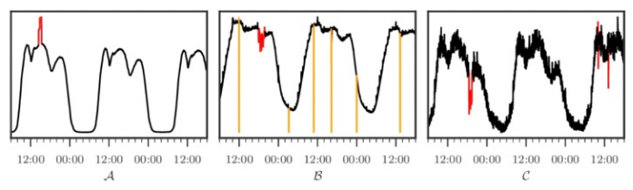 通过建立不同的统计指标:窗口均值变化、窗口方差变化等可以较好的解决下图中(1,2,5)所对应的异常点检测;通过局部极值可以检测出图(4)对应的尖点信息;通过时序预测模型可以较好的找到图(3,6)对应的变化趋势,检测出不符合规律的异常点。