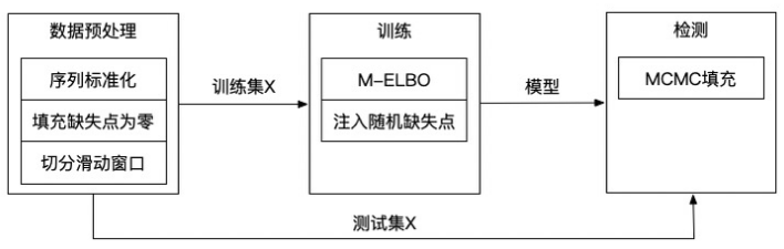 - 检测时使用了MCMC填补的技术处理观测窗口中的已知缺失点,核心思想根据已经训练好的模型,迭代逼近边际分布(下图表示MCMC填补的一次迭代示意图)