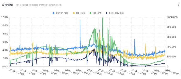 sum(first_play_cnt) as first_play_cnt , casewhenis_nan(sum(failed_cnt)*1.0 / sum(first_play_cnt)) then0.0 elsesum(failed_cnt)*1.0 / sum(first_play_cnt) end as fail_rate fromlog group bytime order bytime)limit 1000003.2 各指标的时序环比图