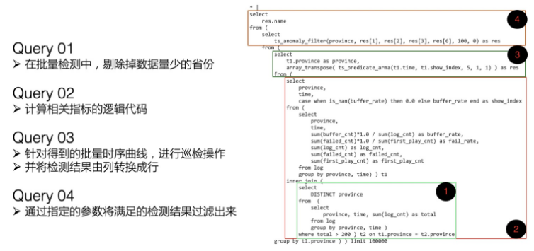 from ( select ts_anomaly_filter(province, res[1], res[2], res[3], res[6], 100, 0) as res from ( select t1.province as province, array_transpose( ts_predicate_arma(t1.time, t1.show_index, 5, 1, 1) ) as res from ( selectprovince,time,case when is_nan(buffer_rate) then 0.0 else buffer_rate end as show_indexfrom (select province, time, sum(buffer_cnt)*1.0 / sum(log_cnt) as buffer_rate, sum(failed_cnt)*1.0 / sum(first_play_cnt) as fail_rate, sum(log_cnt) as log_cnt, sum(failed_cnt) as failed_cnt, sum(first_play_cnt) as first_play_cntfrom log group by province, time) ) t1 inner join ( select DISTINCT province from  ( select province, time, sum(log_cnt) as total from log group by province, time ) where total > 200 ) t2 on t1.province = t2.province  group by t1.province ) ) limit 100000- 针对上述SQL逻辑的具体分析