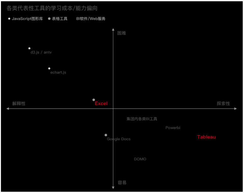 大家在开始动手前,不妨先想一下自己是哪种意图,通常情况下鱼和熊掌不可兼得,数据的灵活变换和细腻表达虽然不矛盾,但很难兼顾。这就促成了我们可用的工具都有一定的偏向性,简单易上手的BI工具可以帮助我们快速完成可视化,但有可能内容差强人意。一些专业的图表代码库理论上可以针对任何细节进行调整,但是效率和门槛存在明显劣势。