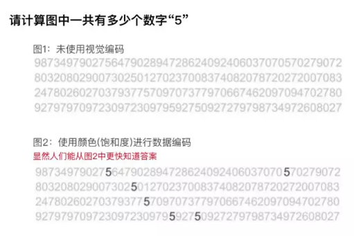 这种心理学现象,叠加颜色色调的处理,很容易促成视觉突出,使我们能够快速注意到被处理的目标数据。上文视觉编码数“5”的举例,便是相似原则的一个案例。