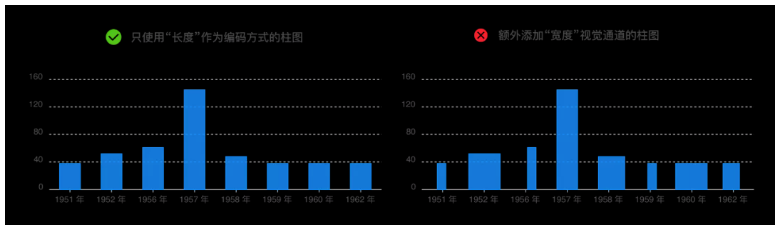 我们结合柱形图做一个举例,下图的柱图使用了宽度(size)映射了一个度量字段数据,宽度影响了长度的有效力,这两个通道的同时使用,使得感知上有趋近面积这一通道,从而影响了整体图表的效果。