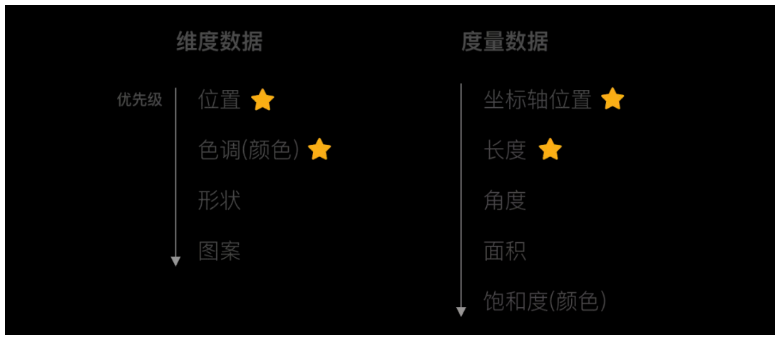 维度和度量所适用的视觉通道是有巨大差异的,例如颜色的色调适用于维度,但不适用于度量。选择正确的视觉通道,令信息传达更有效率。