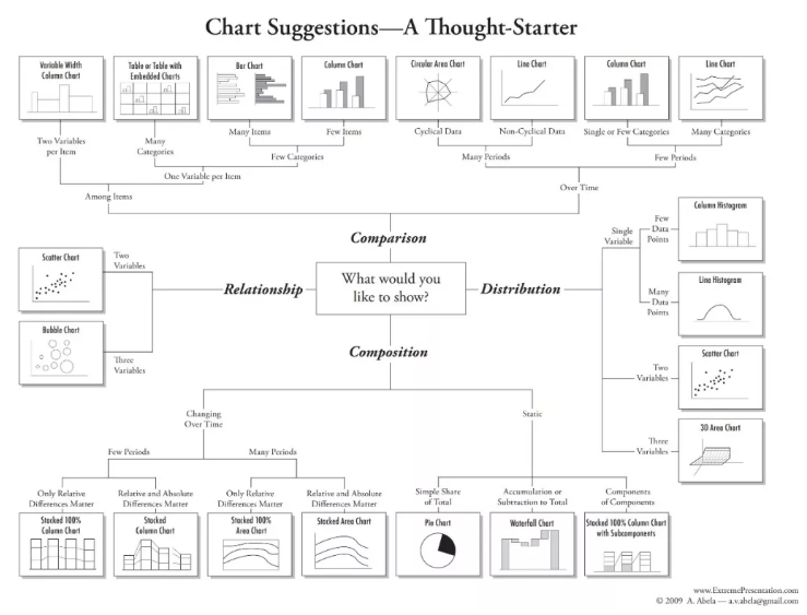 这个网上资料一抓一大把,选择图表前,其实更多的是要想清楚你的数据想传达的目的。数据分析纷纷咋咋,总结起来,不外乎4个目的:对比、聚焦、归纳、演绎。基于这些初始目的出发,我们再选择实例化它。