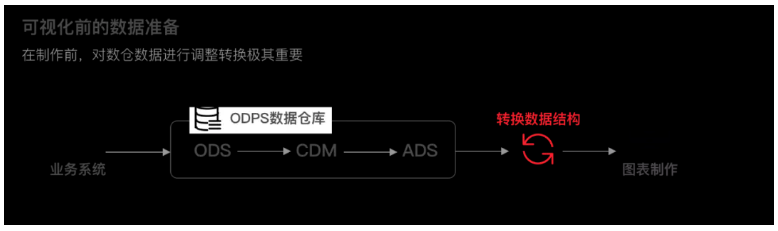 一般来讲,制作数据图表前,或多或少有一系列数据的采集加工环节,以集团开发同学熟悉的ODPS为例,简单来讲如下图流程所示: