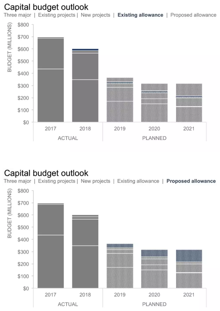 - 上文讲述过视觉通道会相互影响有效性,这里图例中的小正方形尺寸过小,影响了颜色的解读,这就使得蓝色的major projects和浅蓝色的proposed allowance难以区分。(试想一下你在平常遇到的更极端的图例解读困境);