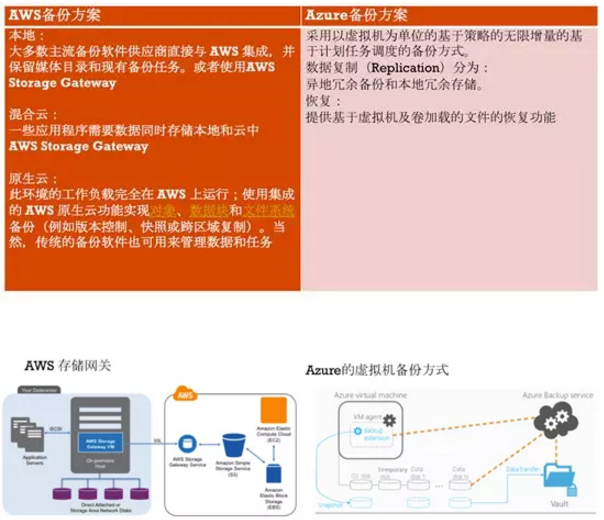 AWS仅提供原生的快照功能及帮助客户上云的手段,数据备份等功能依赖于传统的数据保护厂商;Azure提供基于虚拟机的基本的备份及恢复方式,没有提供CDP等高级功能。