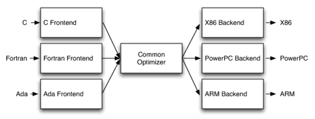 我们知道,几乎任何语言中,代码在 "编译"(解释型语言在运行时也有编译的过程) 的过程中,都会生成一种树状的中间状态,这就是 AST(抽象语法树)。AST 描述了每个表达式/语句中的子语句的执行顺序和执行逻辑,因而它可以被很方便地翻译成目标代码 。基于这种抽象,能合理的将编译器拆分为三阶段:FrontEnd,Optimizer, Backend,从而实现能兼容各种语法形式的语言,更易于迁移并兼容不同架构的cpu。见下图: