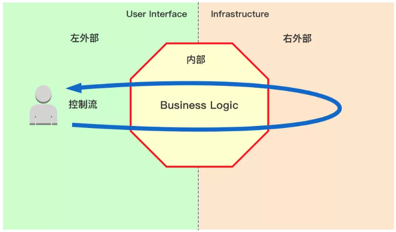 六边形架构是Alistair Cockburn在2005年提出,解决了传统的分层架构所带来的问题,实际上它也是一种分层架构,只不过不是上下,而是变成了内部和外部(如下图所示)。