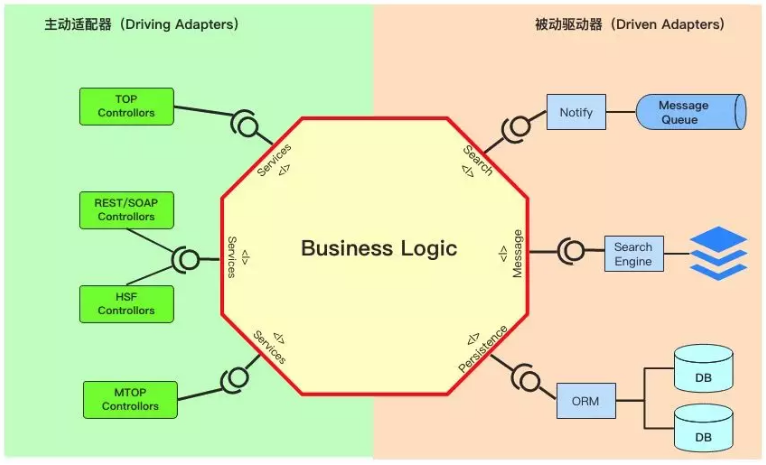 适配器分为两种类型(如下图所示),左侧代表 UI 的适配器被称为主动适配器(Driving Adapters),因为是它们发起了对应用的一些操作。而右侧表示和后端工具链接的适配器,被称为被动适配器(Driven Adapters),因为它们只会对主适配器的操作作出响应。