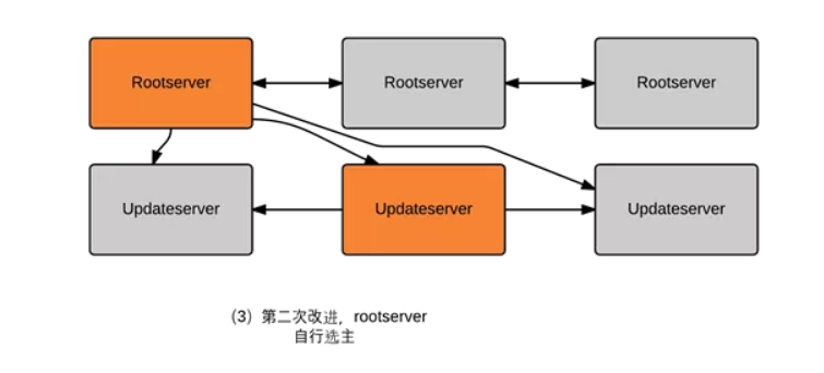 Updateserver仍然通过Rootserver来选主,但这样也存在一个问题,当Updateserver和Rootserver同时故障的时候,Updateserver必须要等Rootserver恢复完成后才能恢复,增加了故障恢复的时间 。在后续的OceanBase版本中,将去除Updateserver这个单写入节点,并将其选主的权力下放到自身,摆脱由Rootserver选主的局面。届时Rootserver的工作会更为简单,单点不会成为OceanBase的瓶颈。