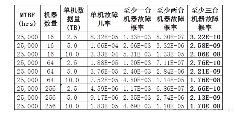 MTBF为机器的平均无故障时间,从表中可以看出三副本同时丧失的概率是极低的。