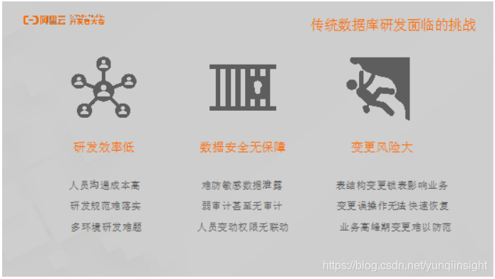 传统数据库研发方式需要面对三个主要的挑战,即研发效低、数据安全无保障、变更风险大。