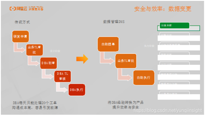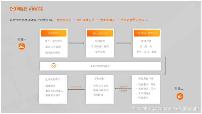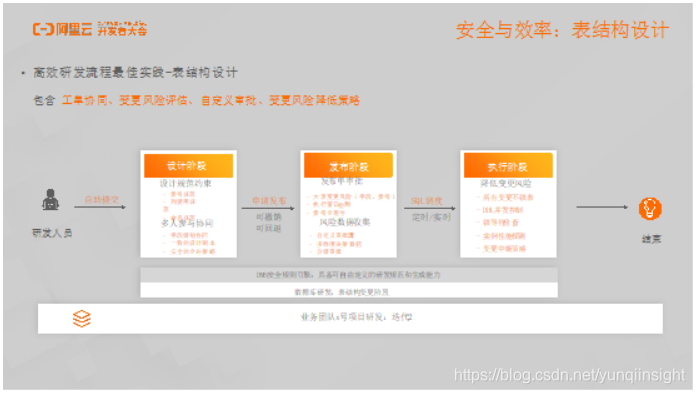 在第二阶段,研发人员发起一个申请工单提交上去,DMS会将DBA的经验和建议提供给研发人员,帮助研发人员优化自身的SQL。如果因为某些原因或者需求必须要违背一定的规范,就需要上升到另外一级进行审批把控。在这个部分,DMS会将风险收集起来提供给审批人,而整个审批过程可以实现自定义,也就是说企业可以根据自身的业务属性决定谁来审批。审批把控通过之后,则直接由发起人进行SQL的落地执行。最后一点就是全局风险掌控,技术负责人可以在产品里面查看今天业务被查询了多少次,有几个张表发生了变更,业务增长情况如何,哪些人员查询了哪些库,返回了多少数据,并且可以看到一些数据库风险报告和数据安全报告,包括安全管理人员提供的数据审计报告,这大致就是整个新型数据库研发流程。