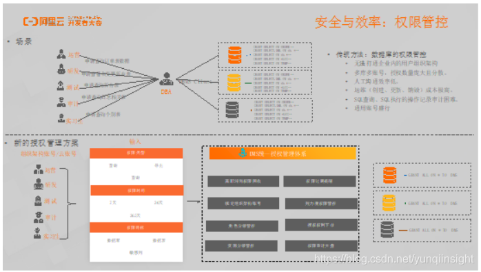 接下来从几个场景来介绍数据管理DMS最佳实践。第一个场景就是权限管控。简单而言,创建一个新的业务,这个业务涉及到新的数据库,这种情况下,运营、开发、测试、审计以及实习生等都需要拥有查询数据库的权限。因此就需要给与他们一个账号,传统数据库研发模式中,都是找DBA进行沟通或者为团队提供一个通用账号。如果和DBA进行沟通,DBA还需要根据具体的需求在邮件里面写清楚为研发人员申请了什么账号,并且需要去数据库实例上为用户赋予相应的权限,整个流程很复杂,沟通成本也很高。