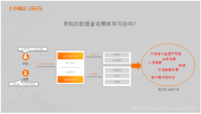 这里有一个问题,就是常规的数据查询需求有风险吗?比如研发人员说他要排查线上的问题,运维人员说他要查过去一年的业务数据,如果处在金融场景的话,大部分企业可能都不会给这些人员真正的数据库账号,因此面对这样的需求就会落到两种解决方案上。