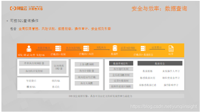 那么,在DMS中是如何避免上述风险的呢?DMS提供了可控的SQL查询操作,其包含了全局权限管控、风险识别、数据脱敏、操作审计以及安全规则引擎等。对于前面所提到的场景而言,研发、测试、运营发起一条SQL查询之后,过程中会有三个拦截点,第一个拦截点是权限检查,其会判断是所执行的SQL语句否有相应数据库和数据表的权限,进一步细化地判断所查询的机器是否是可授权的。DMS还会提供一些智能提示,并且能够提供历史SQL的保存、模板SQL以及格式化等功能。通过了第一个检查点说明用户本人的权限以及查询SQL的权限没有问题。