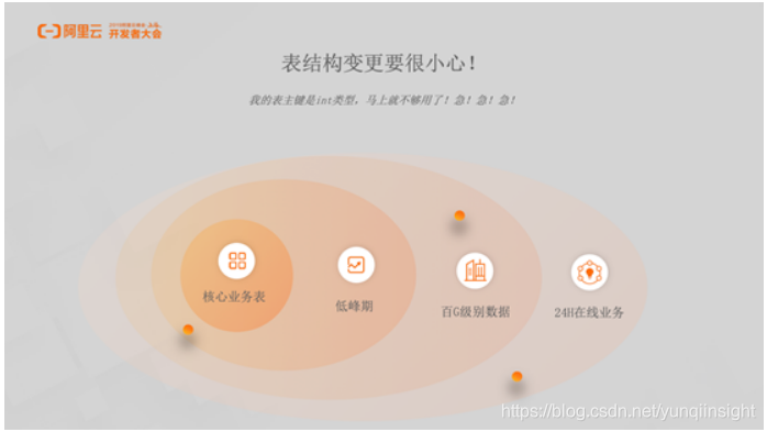 在进行表结构变更时需要很小心。以一个具体的场景作为例子,一个核心业务表负责的是24小时在线业务,这个表非常大并且没有业务低峰期。在这种场景之下,研发同学要执行一个DDL,根据经验来说,这样一定会造成很高的IOPS,还会造成业务抖动。那么,如何避免这样的问题呢?此外,可能还会有其他的问题,比如业务同学说表的主键是int类型,而因为数据量急速增长,马上就要超出int类型所能表示的范围了,再跑就查不到数据了,业务就会出现故障,此时该怎么办?对于这样数据量又大,流量又高的数据表,在DMS中如何避免因为表结构变更而造成的问题呢?
