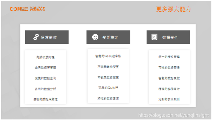 除了上述所分享的功能之外,DMS还提供了很多其他的功能。DMS在AnalyticDB、POLARDB、RDS for MySQL中都作为工具进行了输出。总体而言,DMS能够帮助数据库研发流程做到研发高效、变更稳定以及数据安全。在研发高效层面,DMS能够提供高效的研发流程、全局的数据库管理、便捷的数据查询、易用的数据分析以及通畅的数据库触达;在变更稳定层面,DMS能够提供智能的SQL风险审核、不锁表结构变更、不锁表数据变更、可靠的SQL执行以及精准的数据回滚;在数据安全层面,DMS能够提供统一的授权管理、可控的数据查询、智能的数据脱敏、精确的操作审计以及定制的安全规则。