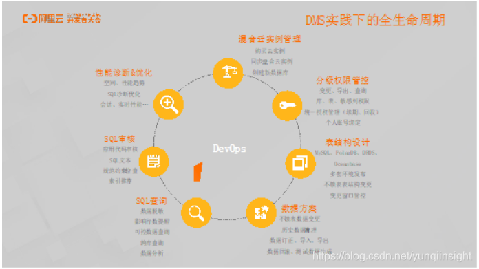如下图所示的是DMS实践下的全生命周期。DMS能够支持数据库研发的全生命周期的各个部分,在混合云实例管理方面,可以用户通过DMS购买云实例、同步混合云实例并且
