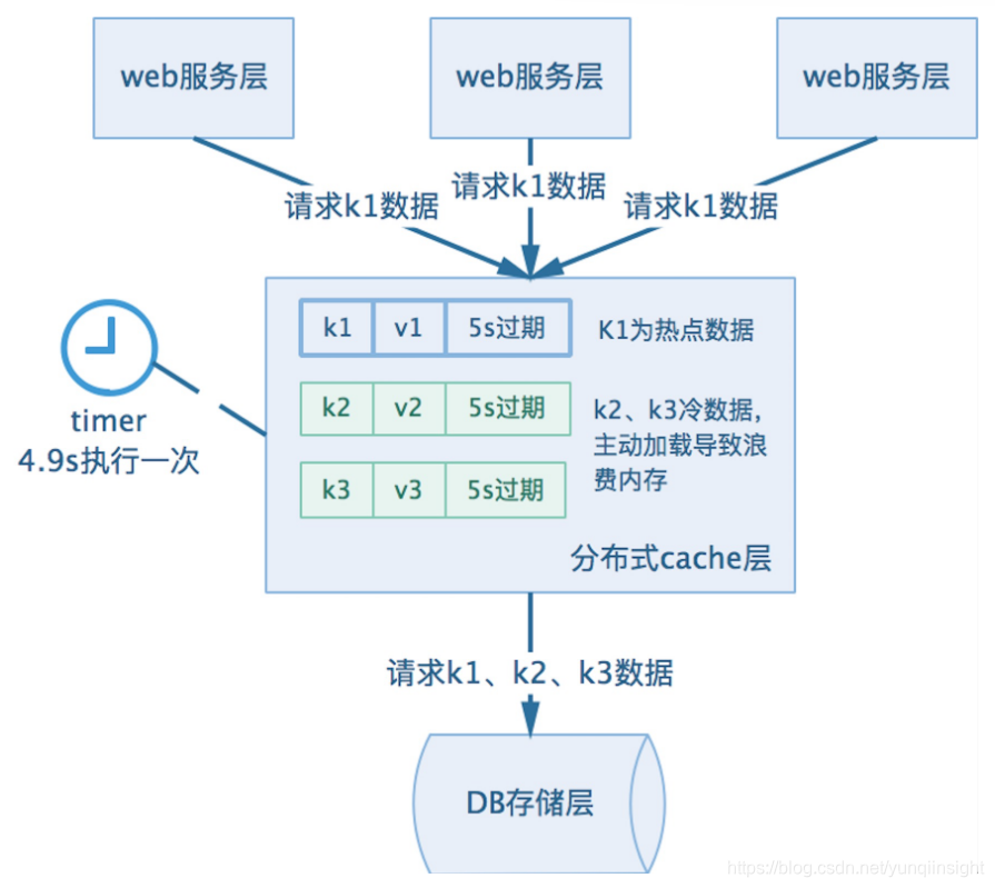 详情可参见下图,分布式缓存中存储着DB中的数据,每隔4.9s就会有定时任务执行去更新缓存,而缓存数据失效时间为5s,从而保证缓存中的数据永远存在,避免缓存击穿的风险。但对于Web请求来说,只会访问k1的缓存数据,也即对于k2和k3数据来说,是无效缓存。