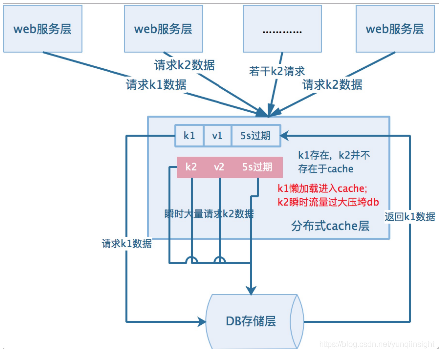 详情见下图,缓存不会主动加载数据,而是根据Web请求懒加载数据。对于请求k1数据来说,发现缓存没有对应数据,到DB查询,然后放入Cache,这是常规流程;但如果有突发流量,大量请求同时访问k2数据,但Cache中没有数据时,请求就会同时落到DB上,可能压垮数据库。