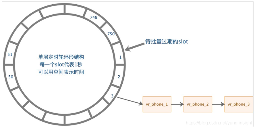 此时DB中不再存储和过期时间相关的数据,而专注于业务数据本身。对于过期的功能我们交给单层定时轮来解决。其本质是一个环形数组,数组每一格代表1秒,每次新加入的元素放在游标的上一格,而游标所指向的位置就是需要过期的vr_phone列表。