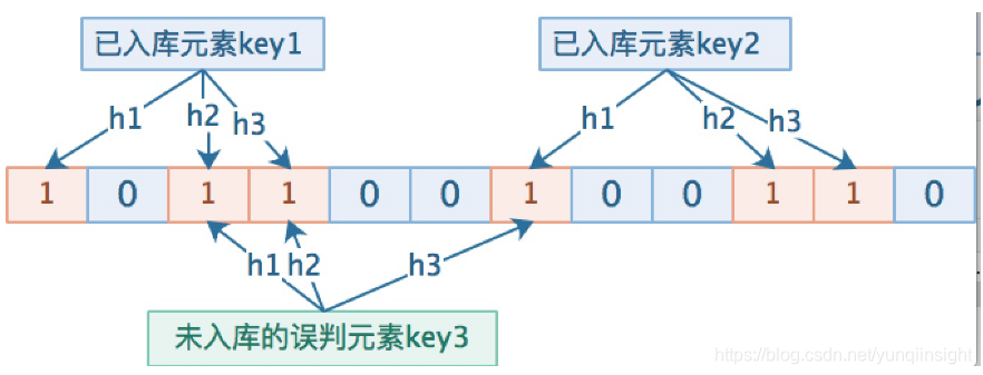 C. 判断元素是否存在,也是将元素的Key根据Hash函数解析成整数,查询若干bit位的值。只要有一个bit位是0,那么这个Key肯定是新元素,不存在;如果所有bit位全都是1,那么这个Key很大概率是已经存在的元素,但也有极小的概率是Key3经过若干Hash函数定位到bit数组后都是Hash冲突的,可能造成误判。