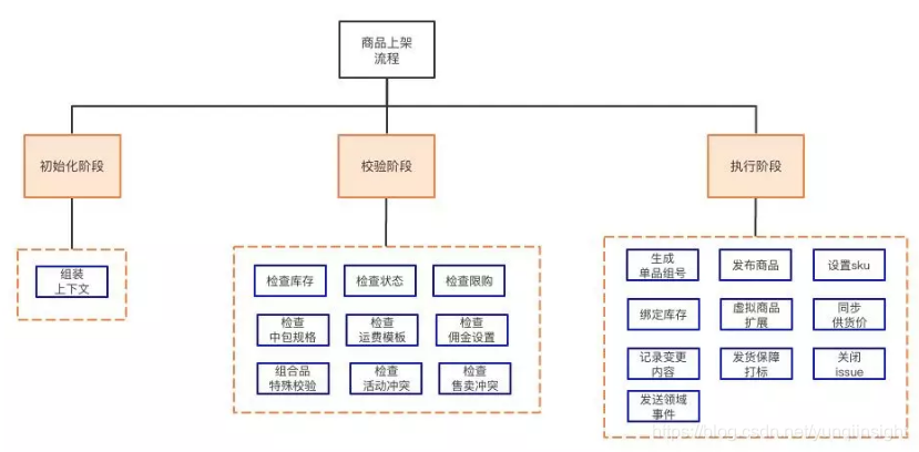 以商品上架为例,程序的入口是一个上架命令(OnSaleCommand), 它由三个阶段(Phase)组成。