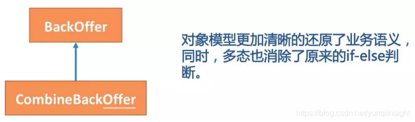 }有没有发现,使用模型的表达要清晰易懂很多,而且也不需要做关于组合品的判断了,因为我们在系统中引入了更加贴近现实的对象模型(CombineBackOffer继承BackOffer),通过对象的多态可以消除我们代码中的大部分的if-else。