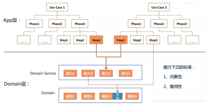 所谓的能力下沉,是指我们不强求一次就能设计出Domain的能力,也不需要强制要求把所有的业务功能都放到Domain层,而是采用实用主义的态度,即只对那些需要在多个场景中需要被复用的能力进行抽象下沉,而不需要复用的,就暂时放在App层的Use Case里就好了。