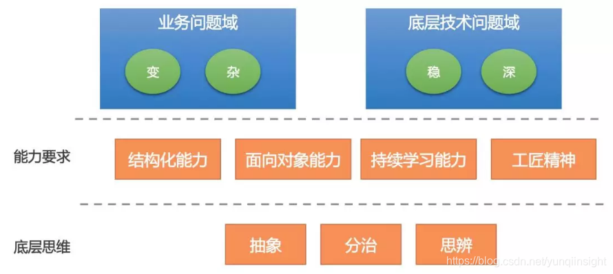 但是,不管是业务技术还是底层技术人员,有一些思维和能力都是共通的。比如,分解问题的能力,抽象思维,结构化思维等等。