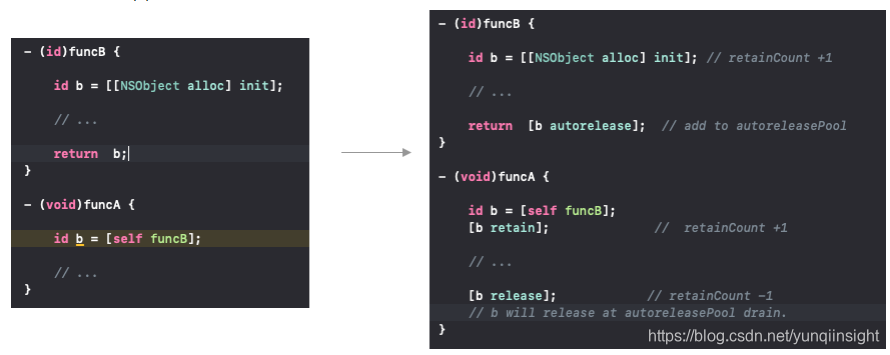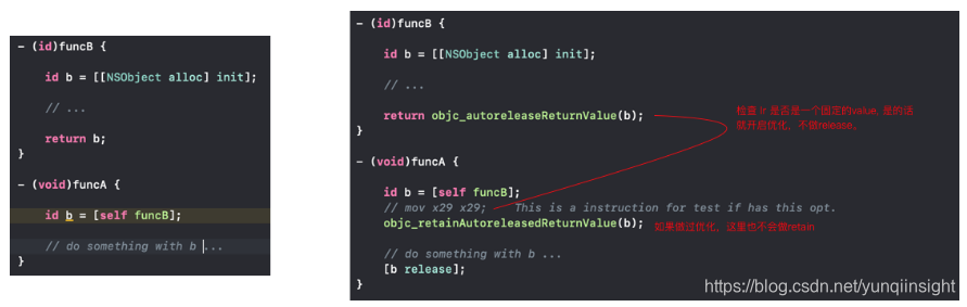 但是我们再详细分析下这个代码,是不是去掉 [b autorelease] 和 [b retain] 这两步操作的话,代码也是可以正常执行的呢? 答案是肯定的, 那么这个操作其实就是可以优化掉的。苹果考虑到了这一点。