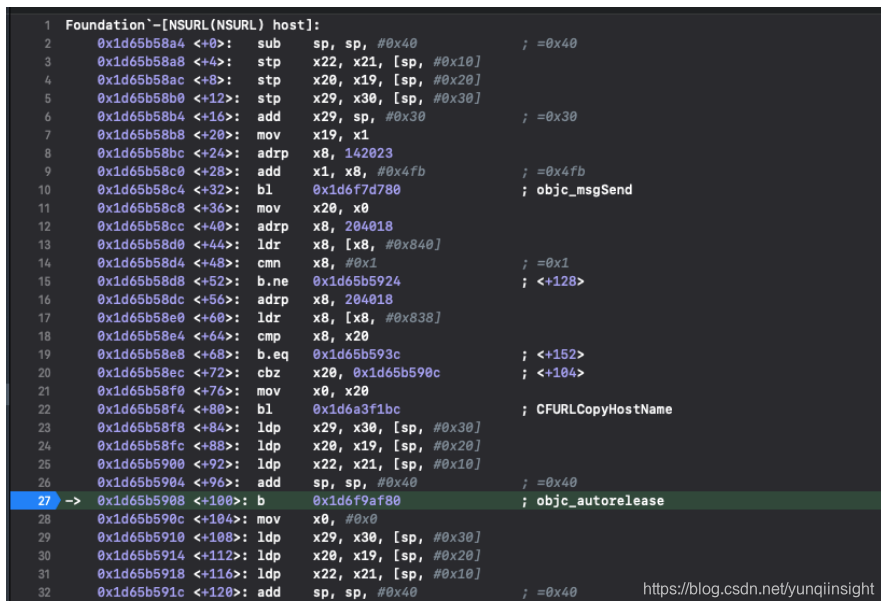 mov x29, x29所以如果[NSURL host]里的实现是类似上述funcB则会走到autorelease优化。也就是返回的 host 没有加入autoreleasePool - +320 行中,因为开启优化,也捕获做retain