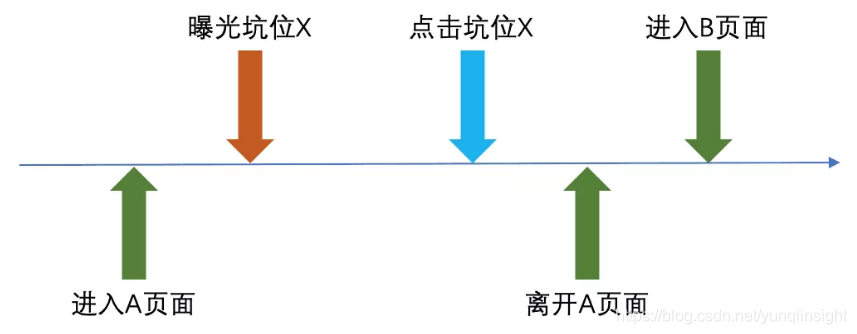 先来讲讲在我们这里是如何定义用户行为埋点的。在如下用户时间轴上,用户进入A页面后,看到了按钮X,然后点击了这个按钮,随即打开了新的页面B。