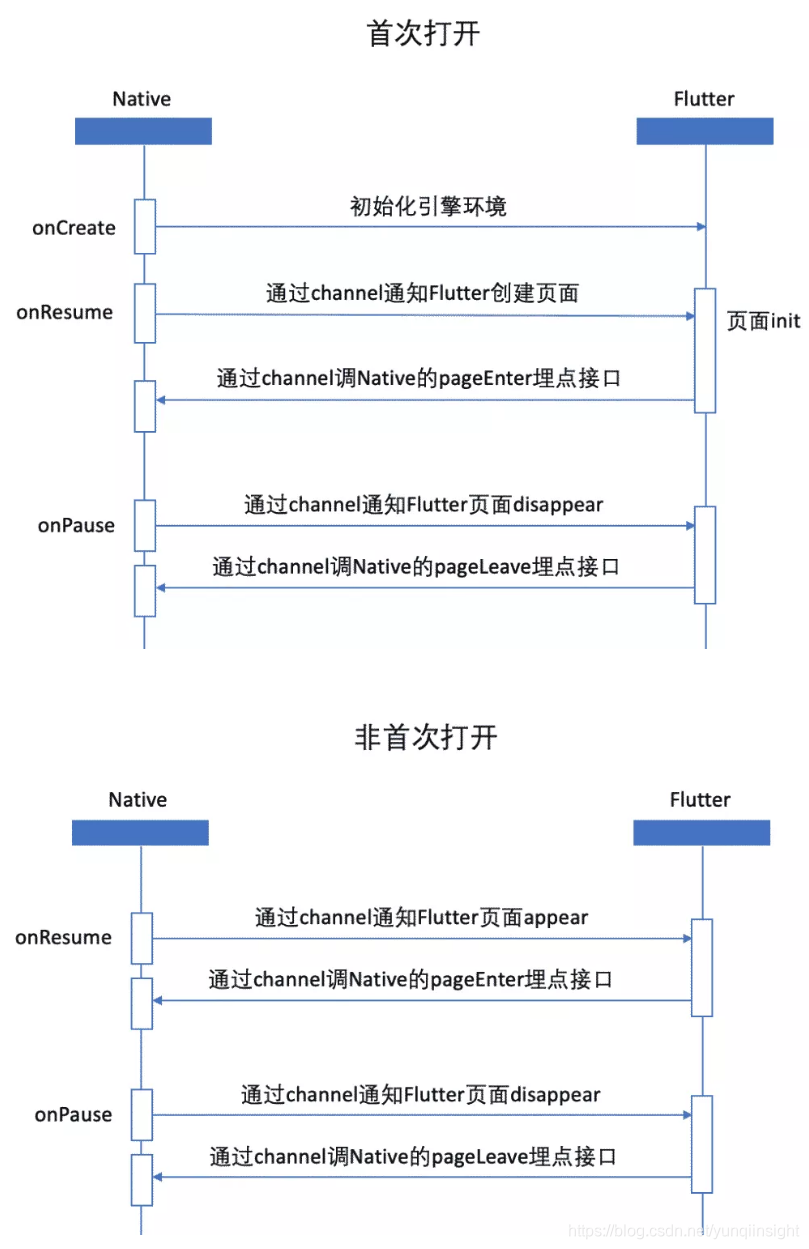 看到这个方案可能会有人问,为什么这么绕,为什么不全部交给Native侧去直接管理呢?交给Native侧去直接管理这样做针对非首次打开这个场景是合适的,但是对首次打开这个场景却是不合适的。但是在首次打开这个场景下,onResume时Flutter页面尚未初始化,此时还不知道页面信息,因此也就不知道进入了什么页面,所以需要在Flutter页面初始化(init)时再回过来调Native侧的进入页面埋点接口。而为了避免开发人员去关注是否为首次打开Flutter页面,因此我们统一在Flutter侧来直接触发进入/离开页面事件。