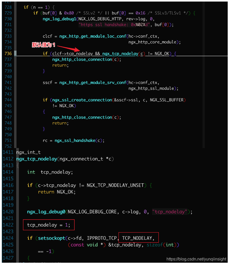 我们知道,小包的载荷率非常小,若网络上出现大量的小包,则网络利用率比较低,就像客运汽车,来一个人发一辆车,可想而知这效率将会很差,这就是典型的 TCP 小包问题,为了解决这个问题所以就有了 Nigle 算法,算法思想很简单,就是将多个即将发送的小包,缓存和合并成一个大包,然后一次性发送出去,就像客运汽车满员发车一样,这样效率就提高了很多,所以内核协议栈会默认开启 Nigle 算法优化。Night 算法认为只要当发送方还没有收到前一次发送 TCP 报文段的的 ACK 时,发送方就应该一直缓存数据直到数据达到可以发送的大小(即 MSS 大小),然后再统一合并到一起发送出去,如果收到上一次发送的 TCP 报文段的 ACK 则立马将缓存的数据发送出去。虽然效率提高了,但对于急需交付的小包可能就不适合了,比如 SSL 握手期间交互的小包应该立即发送而不应该等到发送的数据达到 MSS 大小才发送,所以,SSL 握手期间应该关闭 Nigle 算法,内核提供了关闭 Nigle 算法的选项: TCP_NODELAY,对应的 tengine/nginx 代码如下: