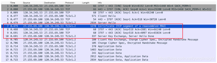 与 Nigle 算法对应的网络优化机制叫 TCP 延迟确认,也就是 TCP Delay Ack,这个是针对接收方来讲的机制,由于 ACK 包是有效 payload 比较少的小包,如果频繁的发 ACK 包也会导致网络额外的开销,同样出现前面提到的小包问题,效率低下,因此延迟确认机制会让接收方将多个收到数据包的 ACK 打包成一个 ACK 包返回给发送方,从而提高网络传输效率,跟 Nigle 算法一样,内核也会默认开启 TCP Delay Ack 优化。进一步讲,接收方在收到数据后,并不会立即回复 ACK,而是延迟一定时间,一般ACK 延迟发送的时间为 200ms(每个操作系统的这个时间可能略有不同),但这个 200ms 并非收到数据后需要延迟的时间,系统有一个固定的定时器每隔 200ms 会来检查是否需要发送 ACK 包,这样可以合并多个 ACK 从而提高效率,所以,如果我们去抓包时会看到有时会有 200ms 左右的延迟。但是,对于 SSL 握手来说,200ms 的延迟对用户体验影响很大,如下图: