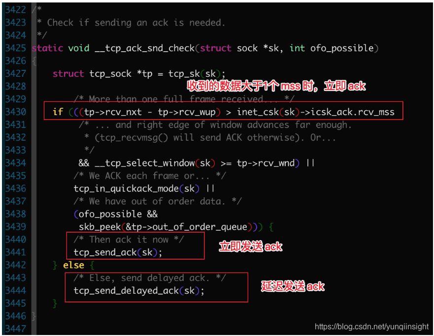 9号包是客户端的 ACK,对 7号服务器端发的证书包进行确认,这两个包相差了将近 200ms,这个就是客户端的 delay ack,这样这次 SSL 握手时间就超过 200ms 了。那怎样优化呢?其实只要我们尽量少发送小包就可以避免,比如上面的截图,只要将7号和10号一起发送就可以避免 delay ack,这是因为内核协议栈在回复 ACK 时,如果收到的数据大于1个 MSS 时会立即 ACK,内核源码如下: