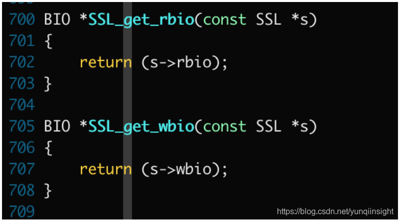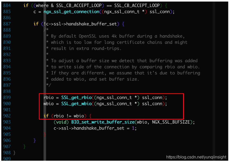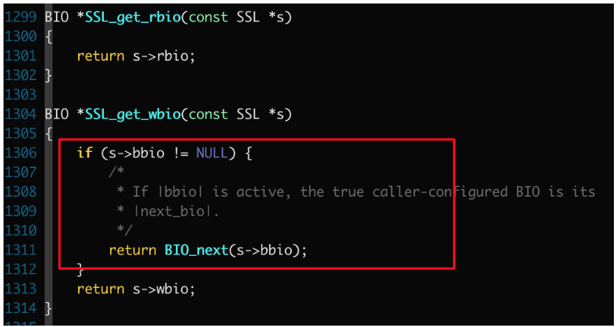 无奈之下只能上 gdb 大法了,调试之后发现果然没有调用到 BIO_set_write_buffer_size,原因是 rbio 和 wbio 相等了,那为啥以前没有这种情况现在才有呢?难道是升级 openssl 的原因?继续查 openssl-1.0.2 代码:
