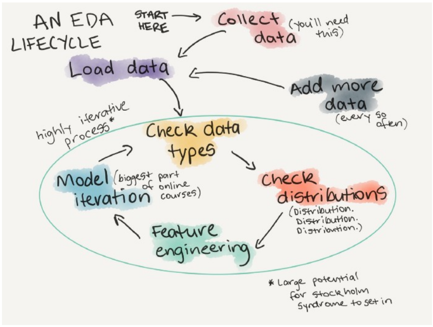 探索性数据分析生命周期的示例(每次遇到新数据集时都会执行的操作)。更多关于探索性数据分析的详细介绍。