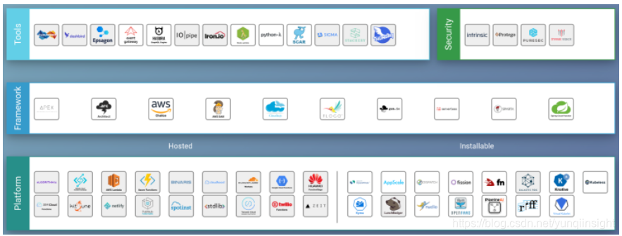 从社区来看,CNCF 云原生基金会正通过 Serverless 工作组协调社区讨论并促进规范和标准的形成,工作组产出了 Serverless 白皮书和全景图等重要内容。其中,全景图将目前的生态划分为了平台层,框架层,工具链层和安全层这四个模块。