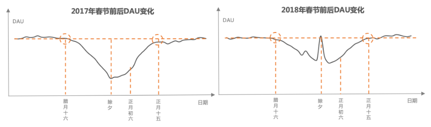 如图,通过对近两年春节前后的 DAU 的变化趋势进行统计分析,我们发现,春节对 DAU 的影响持续以除夕为中心的近一个月的时间(从腊月十六到正月十五左右),而传统春节放假的 7 天是 DAU 的最低谷( 18 年除夕晚有春晚红包加持除外)。
