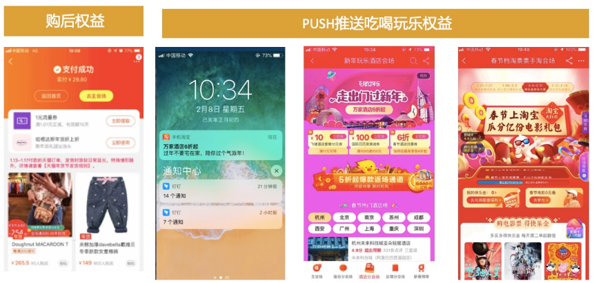 由于快递物流、商家打烊等因素,春节是电商的淡季。对于手淘来说,在春节期间,用户的活跃程度有明显的下滑, DAU 出现一段时间的低谷。通过算法提前预测春节期间活跃度会发生下降的预警人群,配合不同阶段的用户运营干预(在节前预热期结合春节“吃喝玩乐”的场景,算法个性化推荐相应的虚拟权益;春节期间通过 PUSH 消息每日推送提升来访率),可以有效地促进用户回访、扼制用户活跃度的降低。