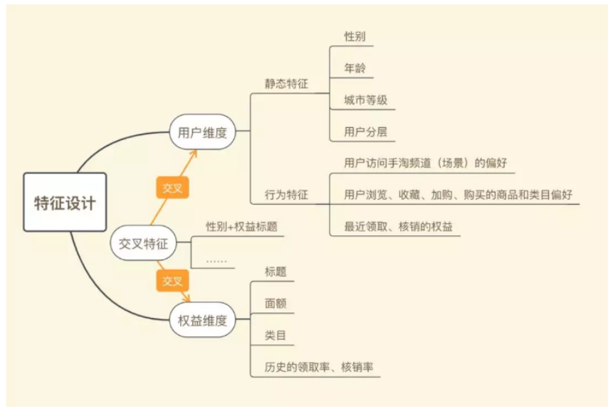 如图所示,在特征的设计上,主要包括用户维度特征、权益维度特征,以及用户和权益的交叉特征: